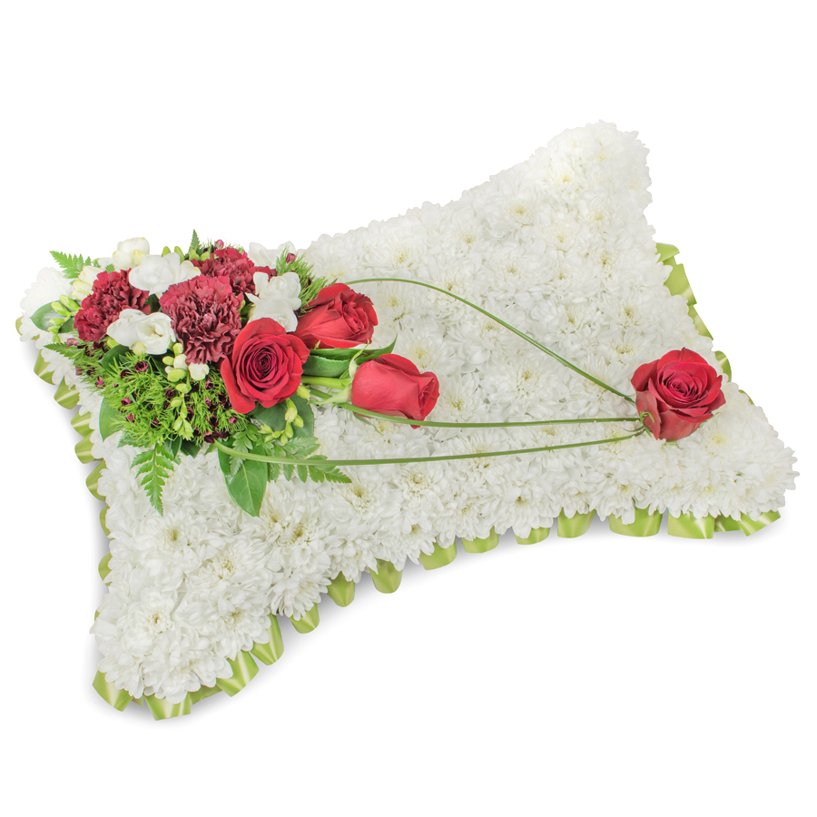 Send your heartfelt condolences with our timeless sympathy bouquet, featuring a classic combination of white chrysanthemums, red roses, white freesias, and dark red carnations. Accented with dianthus and bear grass, this arrangement offers enduring beauty and elegance.